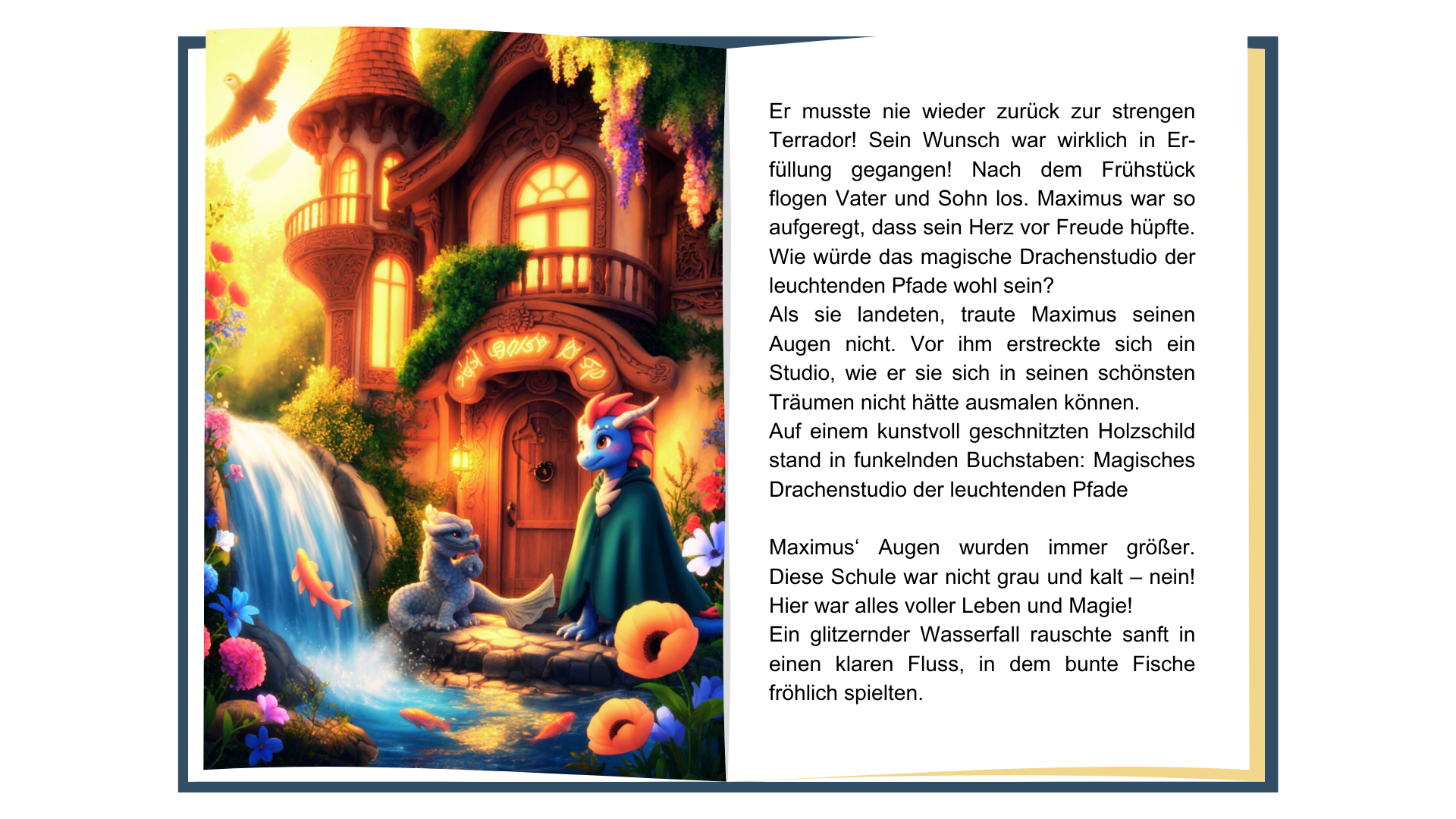 stellen Sie sich vor, Ihr Kind wäre ein junger Drache wie Maximus, voller Träume und verborgener Talente, die darauf warten, entdeckt zu werden. In der strengen Schule Feuerzorn fühlt er sich oft unverstanden, weil nicht jede seiner besonderen Fähigkeiten ins Schema passt. Doch eines Tages stößt Maximus auf das Drachenstudio der leuchtenden Pfade – einen Ort, an dem er ermutigt wird, seine einzigartigen Stärken zu entfalten und zu wachsen. Dort lernt er nicht nur, Schriftrollen zu lesen, in Feuerschrift zu schreiben und die Geheimnisse der Drachenarithmetik zu entschlüsseln, sondern auch, auf sein Herz zu hören und mitfühlend mit anderen umzugehen.